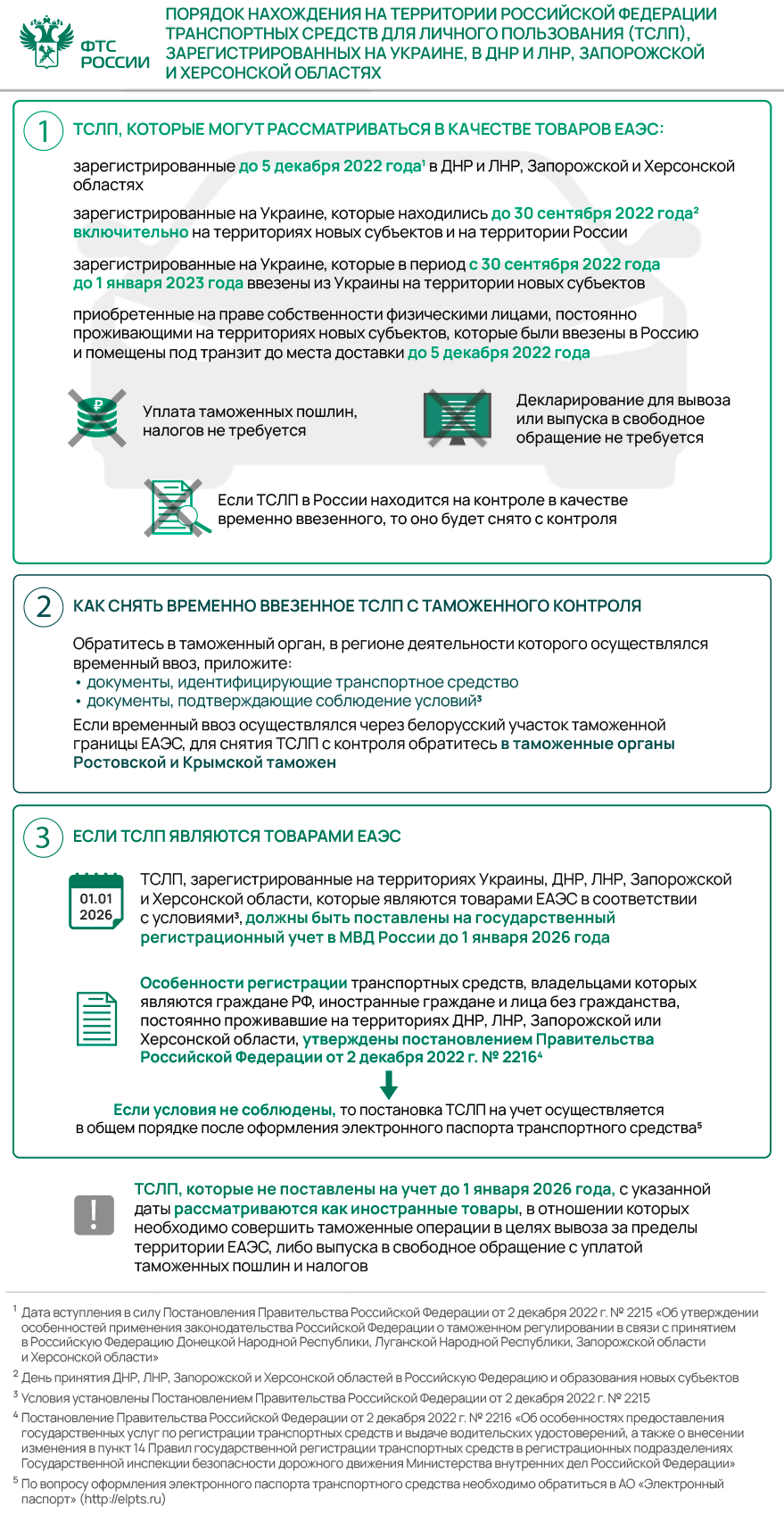 Зарегистрированные на Украине, в ДНР, ЛНР, Запорожской и Херсонской областях транспортные средства для личного пользования, являющиеся товарами ЕАЭС, нужно поставить на учет до 1 января 2026 г.