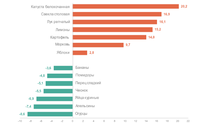 В апреле изменились цены на отдельные виды плодоовощной продукции: на капусту белокочанную +20,2%, свеклу столовую +16,9%, лук репчатый +16,1%, лимоны +15,2%, картофель +14,0%, морковь +9,7%, яблоки +2,8%, ягоды замороженные +2,4%, виноград +1,7%. Снизились цены: на огурцы (-8,6%), апельсины (-7,4%), чеснок (-5,5%), перец сладкий (-5,1%), помидоры (-4,8%), бананы (-3,6%), груши (-1,7%).