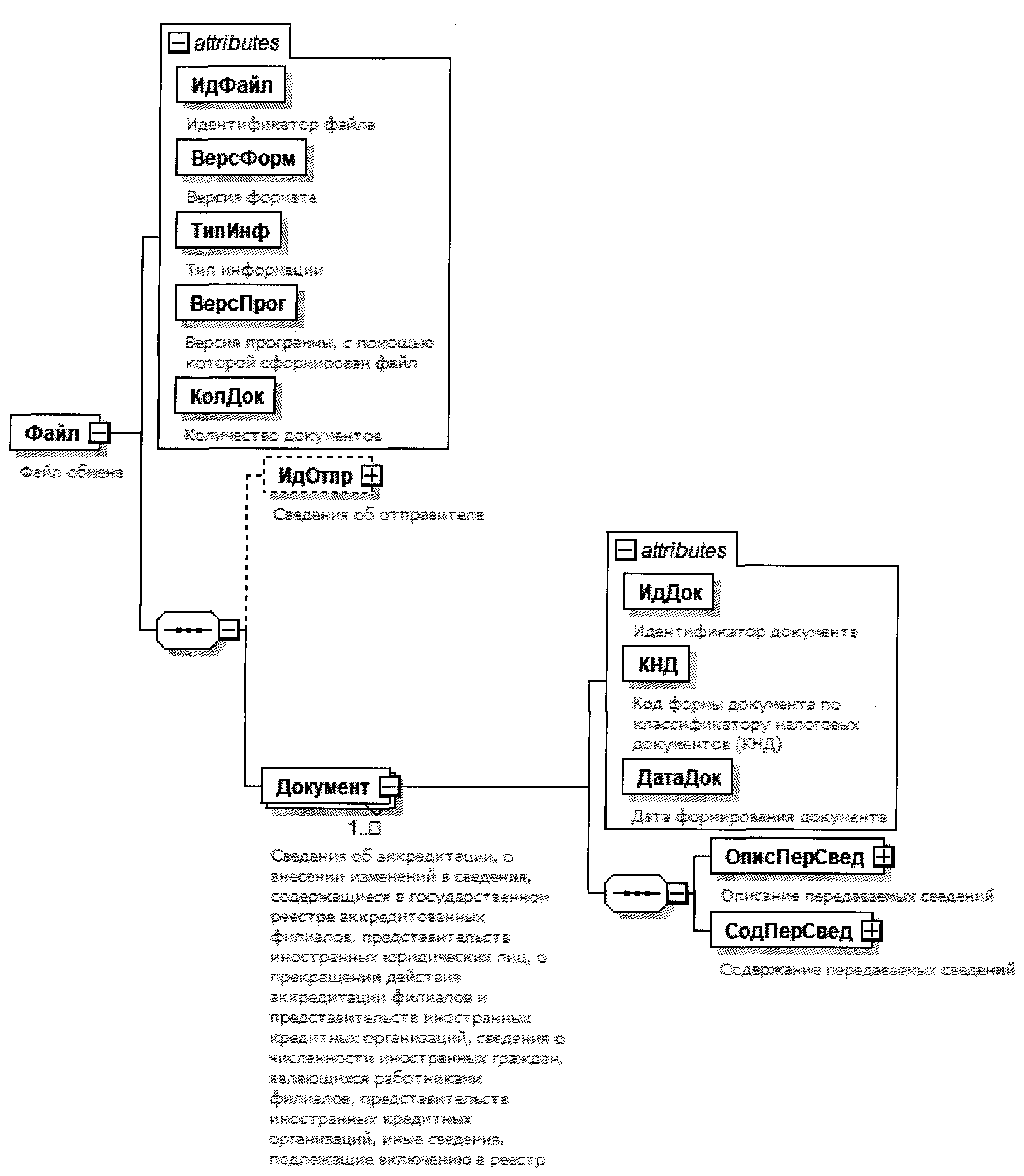 | Сведения об аккредитации в отношении филиала иностранного юридического лица | Аккред | С | Н | Состав элемента представлен в таблице 4.6. Элемент обязателен при <ПрАккред>=1 и отсутствует при <ПрАккред>=0 | |