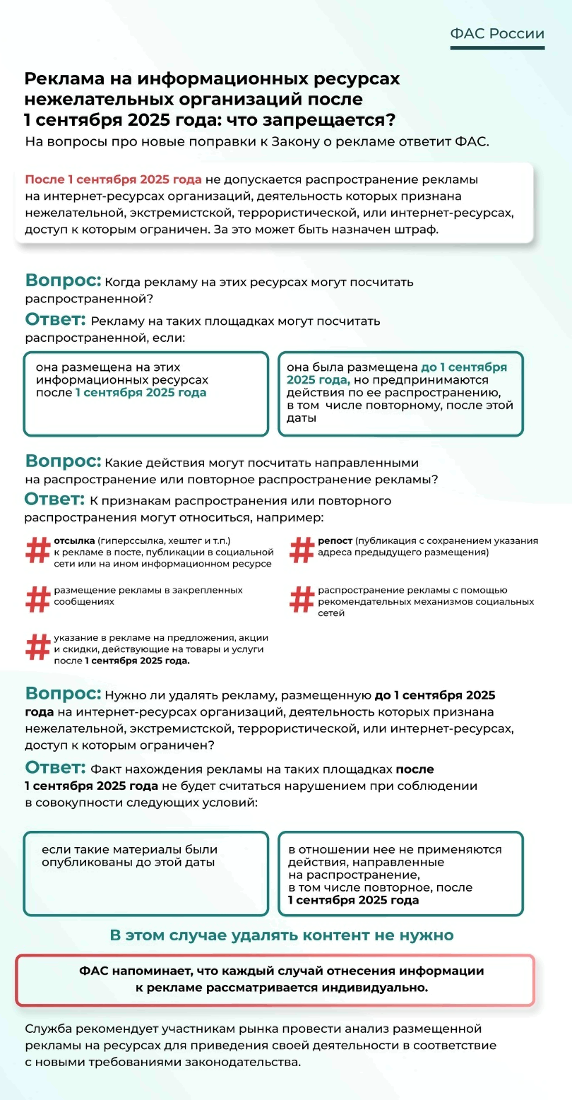 Разъяснения Федеральной антимонопольной службы от 25 июля 2025 г. "Реклама на информационных ресурсах нежелательных организаций после 1 сентября 2025 года: что запрещается?"