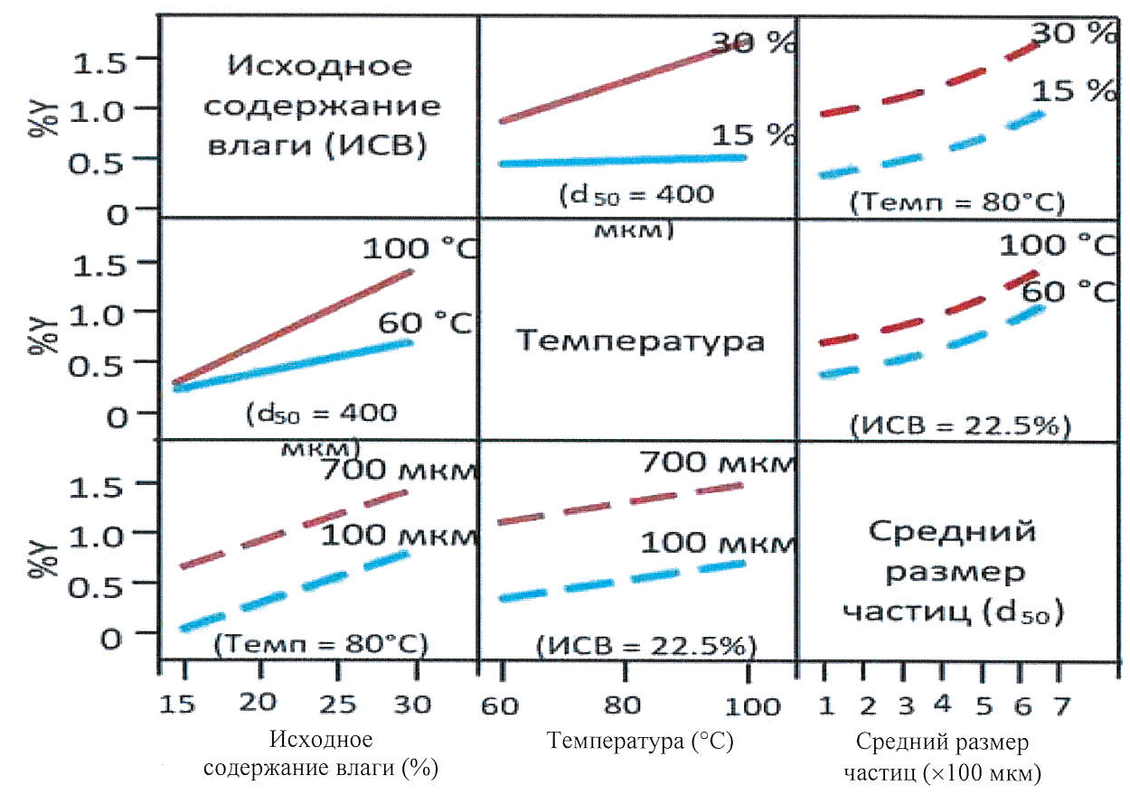 Рисунок 2 иллюстрирует наличие или отсутствие влияния взаимодействий между тремя параметрами технологического процесса на содержание продукта деградации Y. Рисунок показывает серию двумерных графиков, отражающих влияние взаимодействий между тремя параметрами технологического процесса (исходным содержанием влаги, температурой, средним размером частиц) сушки гранулята (промежуточный продукт лекарственного препарата) на продукт деградации Y. Относительные наклоны линий или кривых на графике указывают на наличие взаимодействия. В данном примере взаимодействуют исходное содержание влаги и температура, а исходное содержание влаги и средний размер частиц - нет, равно как и температура и средний размер частиц.