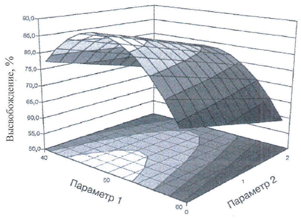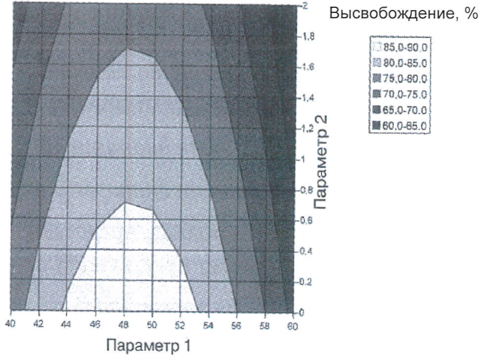 Пример 1. Графики степени высвобождения действующего вещества изображены в виде диаграммы поверхности (рисунок 3) и контурной диаграммы (рисунок 4). Параметры 1 и 2 являются факторами операции гранулирования, которые влияют на степень высвобождения действующего вещества из таблетки (например, характеристика вспомогательного вещества, содержание воды, размер гранул).