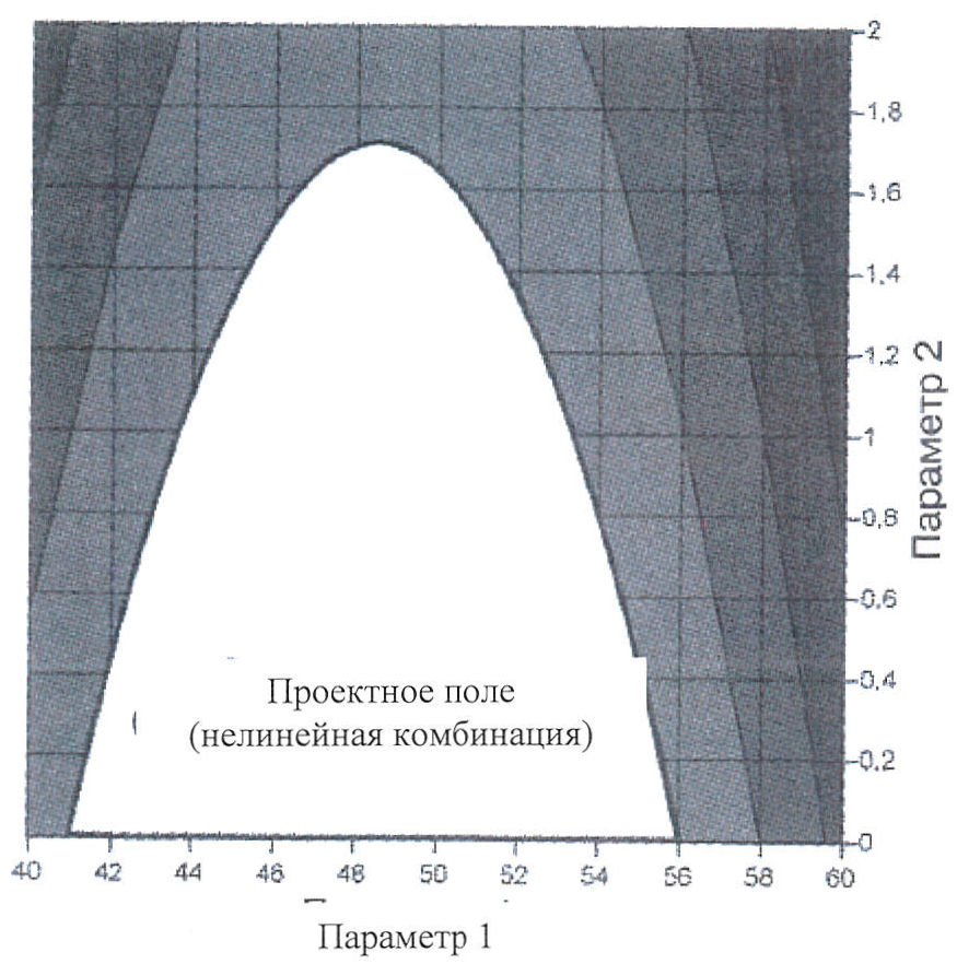 На рисунках 5 и 6 приводятся два примера потенциальных проектных полей. Проектное поле на рисунке 5 задано нелинейной комбинацией диапазонов параметров, оказывающей влияние на степень высвобождения действующего вещества. В этом примере проектное поле выражается с помощью уравнения поверхности степени высвобождения, решаемого в параметрах приемлемого уровня высвобождения (80%). Приемлемый диапазон одного параметра зависит от значения другого, например: