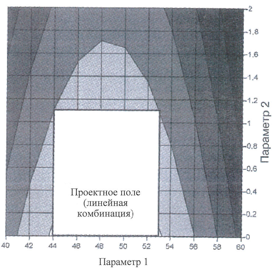 В этом примере рассматриваются только два параметра, поэтому их несложно представить графически. При наличии нескольких параметров проектное поле для двух параметров можно представить способом, аналогичным представленным выше примерам, в случае получения других значений (например, высоких, средних, низких) - в пределах диапазона третьего параметра, четвертого параметра и др. Альтернативно проектное поле можно выразить математически с помощью уравнений, описывающих зависимости между параметрами для успешной операции.