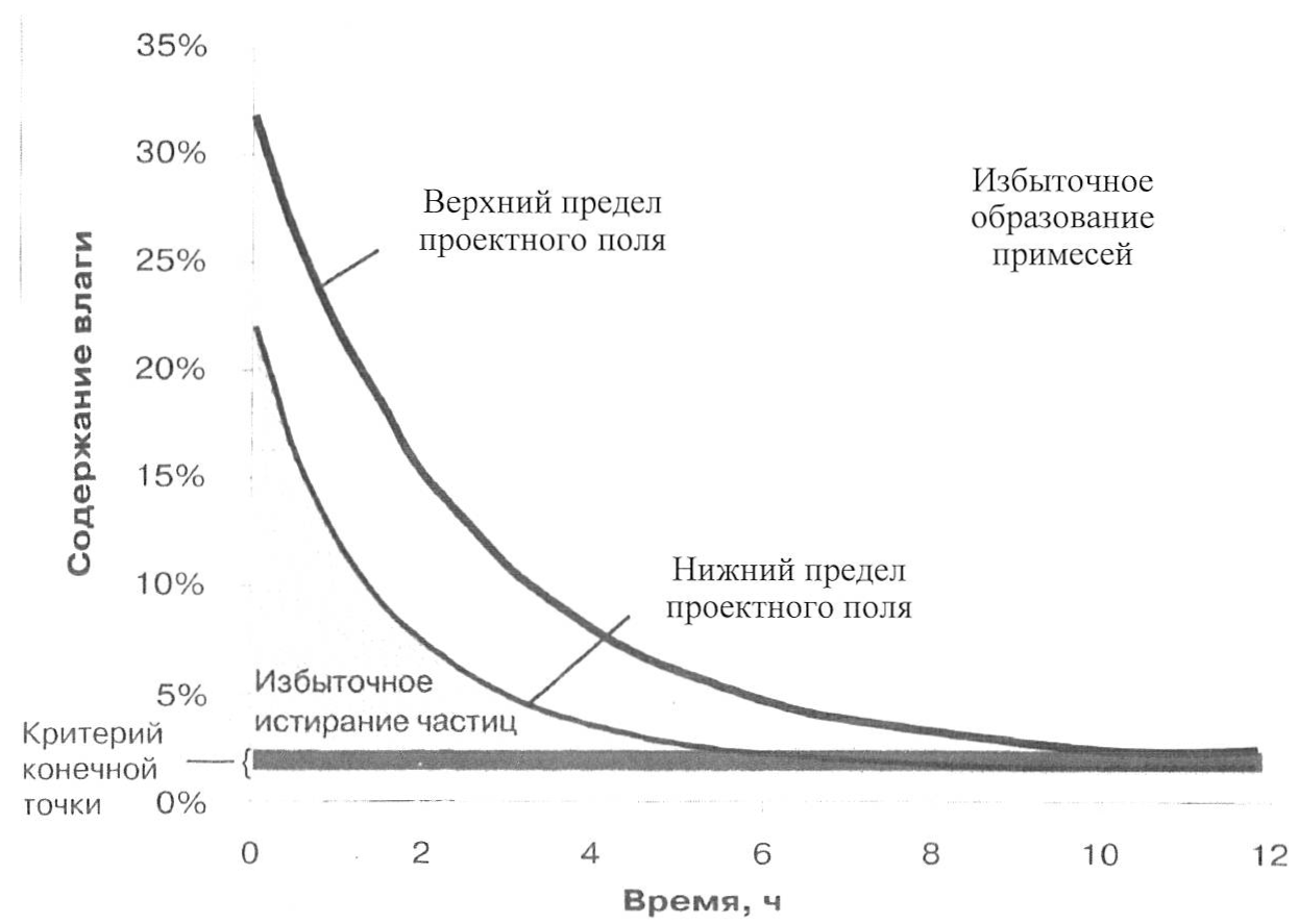 Пример 3. Проектное поле для операции сушки, которая зависит от динамики температуры и (или) давления во времени. Конечная точка для содержания остаточной влаги составляет 1 - 2%. Работа выше верхнего предела проектного поля может привести к избыточному образованию примесей, а работа ниже нижнего предела проектного поля может привести к избыточному истиранию частиц.