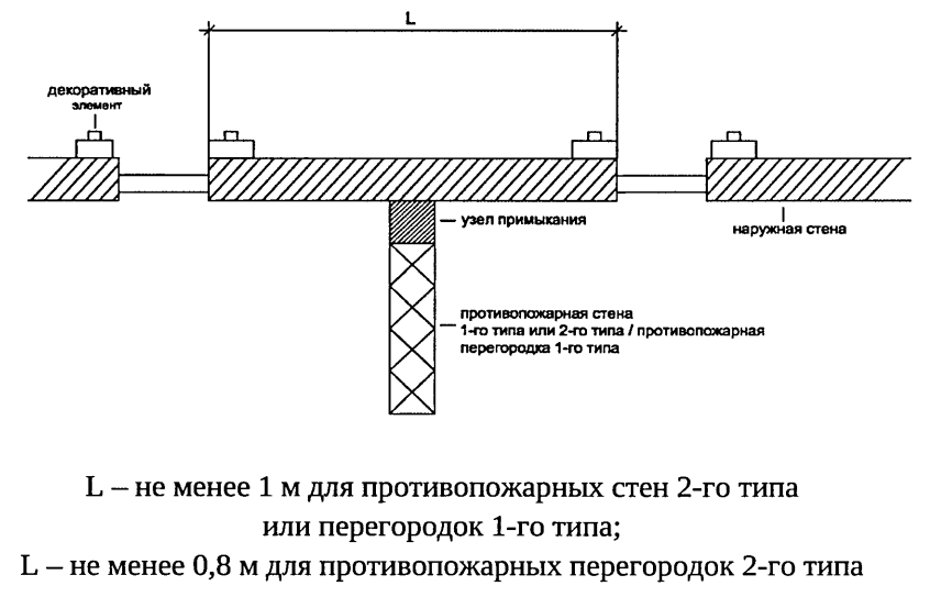 Рисунок А1. Узел примыкания наружной стены и противопожарной преграды к пунктам 5.3.6 и 5.4.11 настоящего свода правил. Определение ширины простенка.