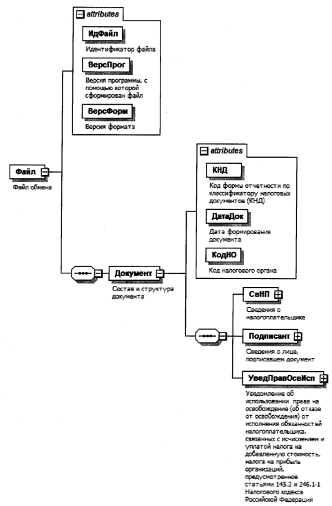 1. Настоящий документ описывает требования к XML-файлам (далее - файл обмена) передачи в налоговые органы уведомления об использовании права на освобождение (об отказе от освобождения) от исполнения обязанностей налогоплательщика, связанных с исчислением и уплатой налога на добавленную стоимость, налога на прибыль организаций, предусмотренного статьями 145.2 и 246.1-1 Налогового кодекса Российской Федерации, в электронной форме.