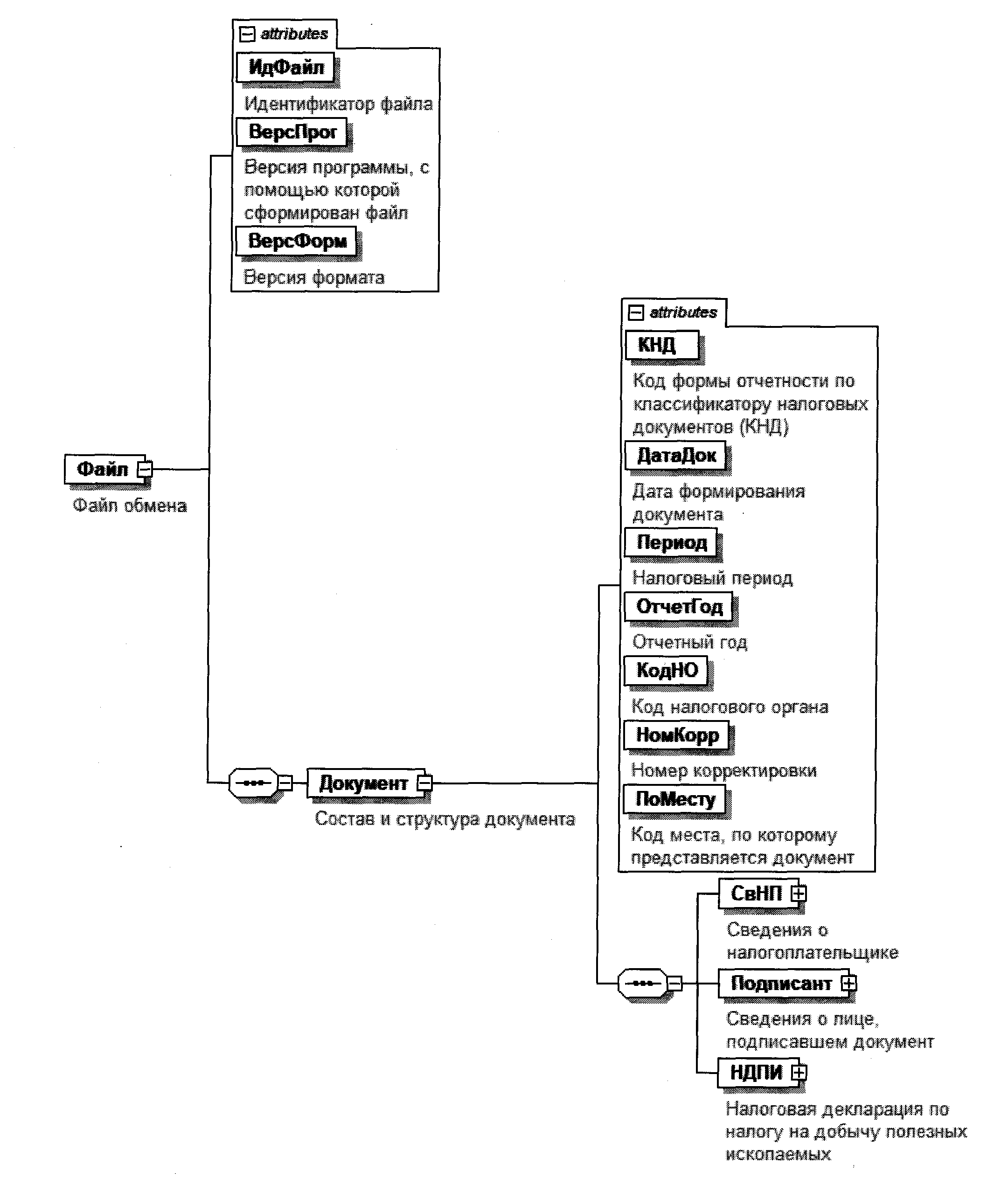 | Расчет суммы налоговых вычетов по участку недр по месяцу и году возникновения (окончания) права на налоговый вычет | РасчНалВычПер | С | ОМ | Состав элемента представлен в таблице 4.48. Признак множественности элемента "М" может принимать значение от 1 до 36 |