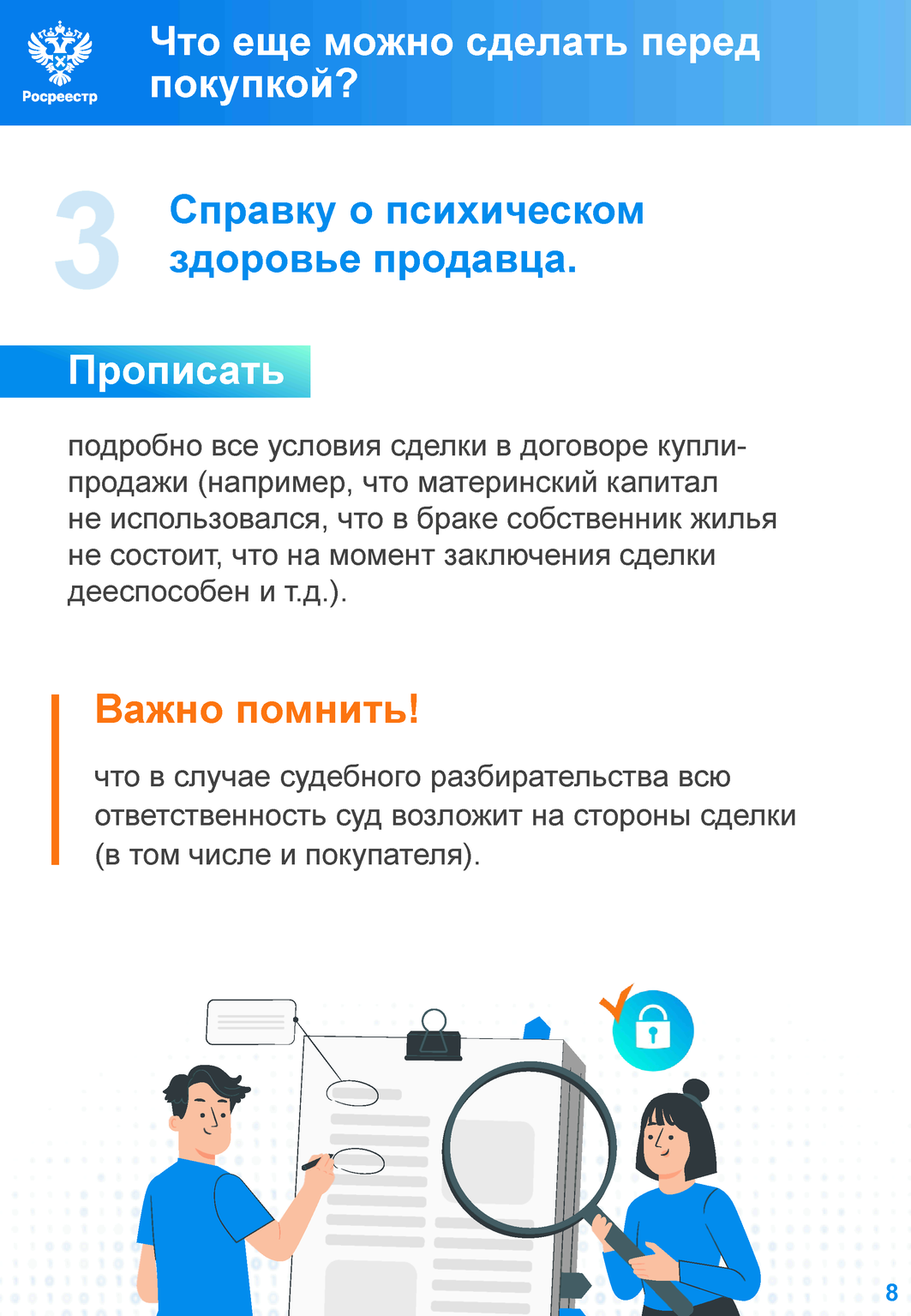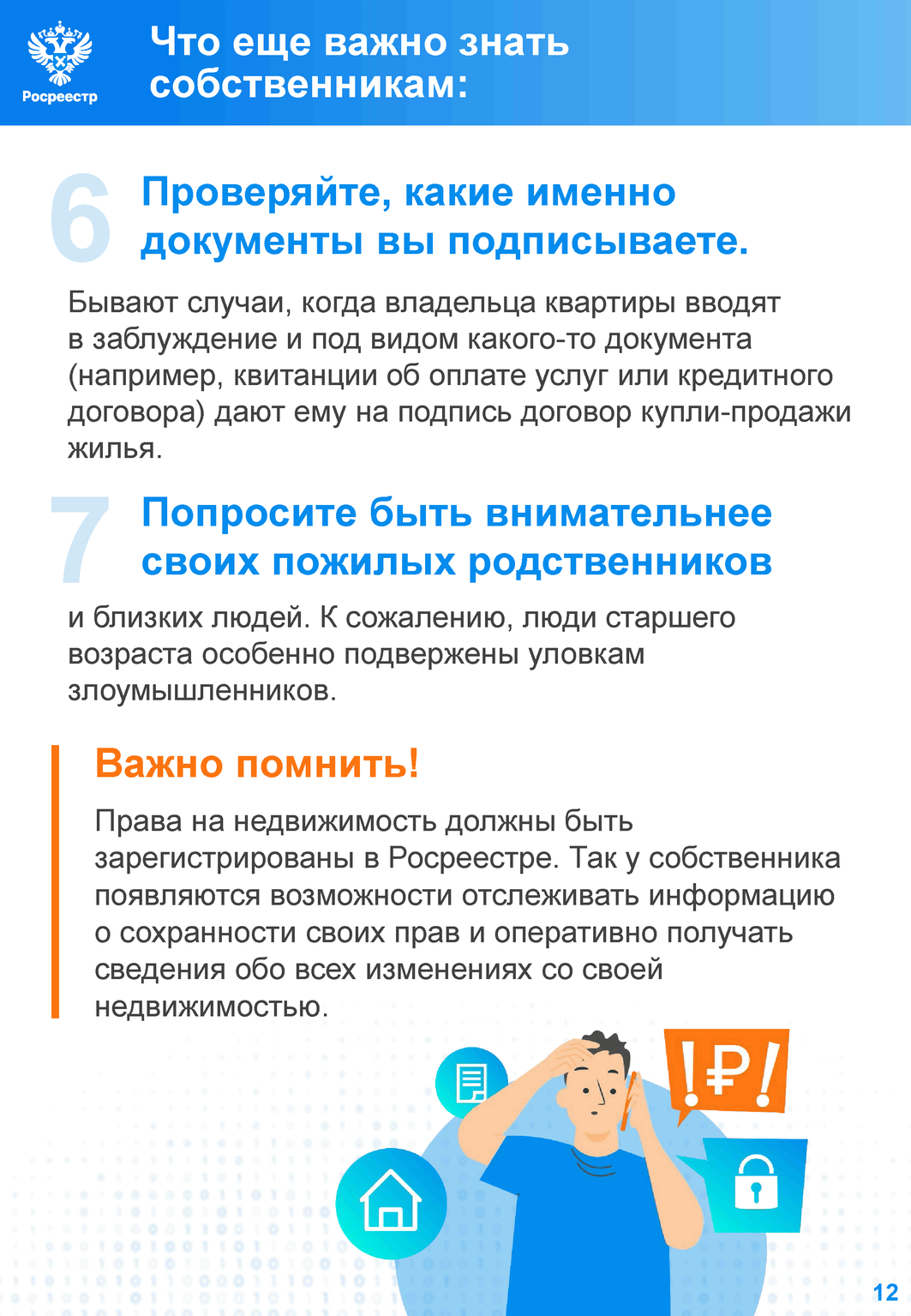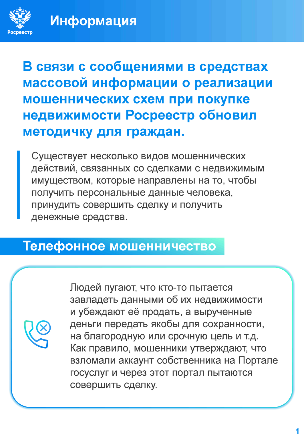 В связи с сообщениями в СМИ о реализации мошеннических схем при покупке недвижимости Росреестр обновил методичку для граждан. Пособие в простой и понятной форме рассказывает гражданам, на что следует обращать внимание перед покупкой жилья, какие дополнительные документы запросить у продавца, что учесть в договоре купли-продажи и какие меры помогут в борьбе с кибермошенниками.