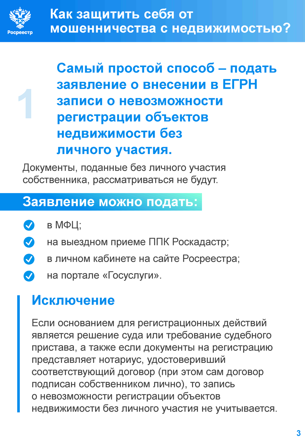 1. Самый простой способ - подать заявление о внесении в ЕГРН записи о невозможности регистрации объектов недвижимости без личного участия. Документы, поданные без личного участия собственника, рассматриваться не будут.