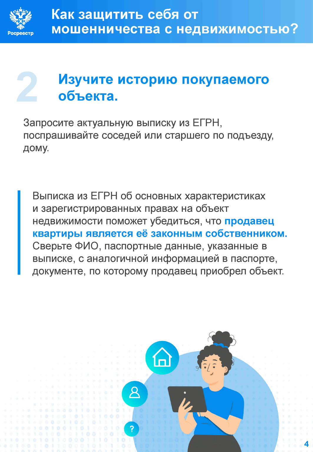 Следует изучить историю покупаемого объекта. Запросите актуальную выписку из ЕГРН, поспрашивайте соседей или старшего по подъезду, дому. Выписка поможет убедиться, что продавец квартиры является ее законным собственником. Из нее будет понятно, отсутствуют ли в отношении квартиры обременения, информация о признании продавца недееспособным и др., а также чем именно (объектом недвижимости или долей в праве на него) владеет человек.