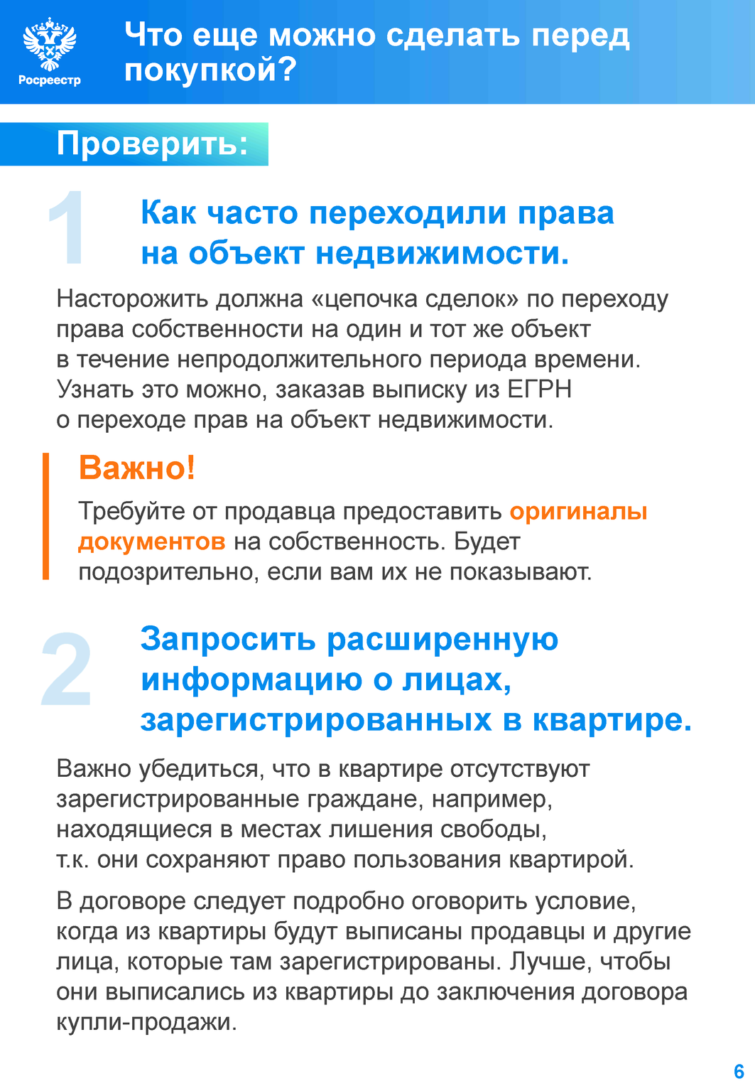 1. Как часто переходили права на объект недвижимости. Насторожить должна "цепочка сделок" по переходу права собственности на один и тот же объект в течение непродолжительного периода времени. Узнать это можно, заказав выписку из ЕГРН о переходе прав на объект недвижимости.