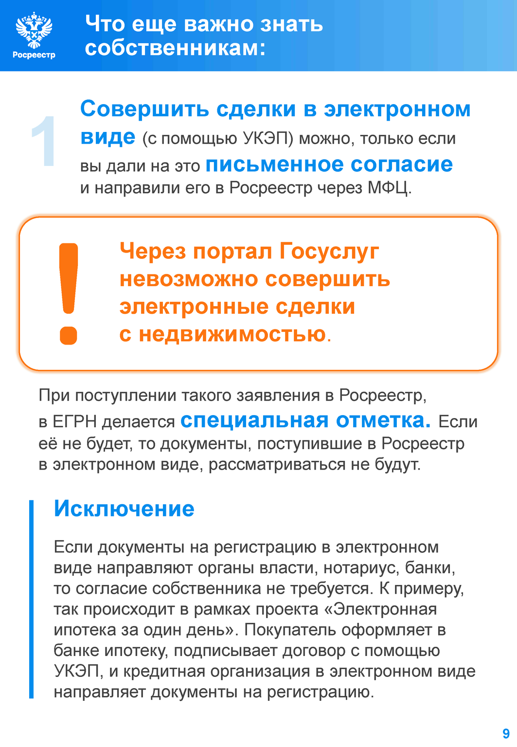 1. Совершить сделки в электронном виде (с помощью УКЭП) можно, только если вы дали на это письменное согласие и направили его в Росреестр через МФЦ. При поступлении такого заявления в ЕГРН делается специальная отметка. Если её не будет, поступившие электронные документы рассматриваться не будут.