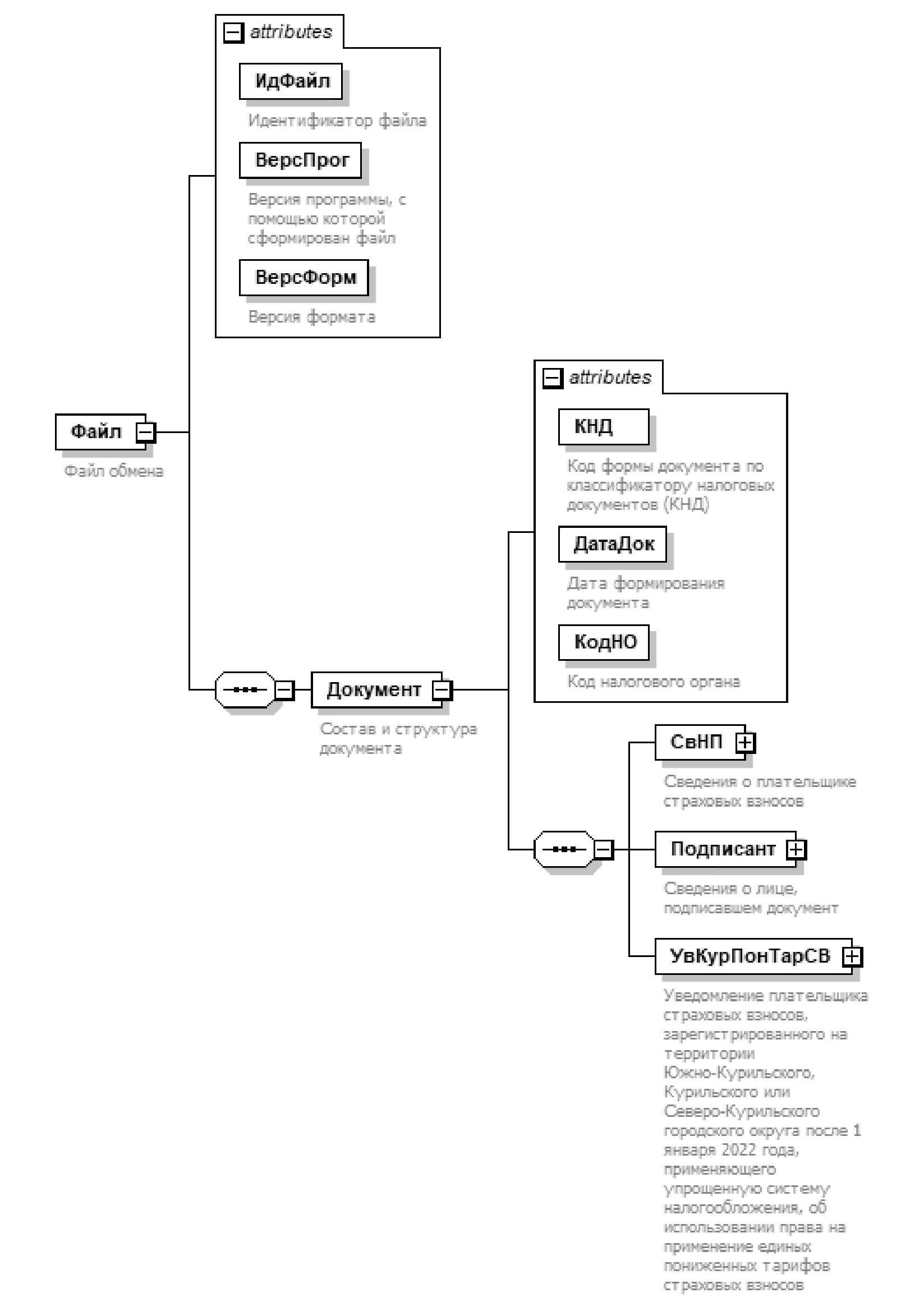 | Уведомление плательщика страховых взносов, зарегистрированного на территории Южно-Курильского, Курильского или Северо-Курильского городского округа после 1 января 2022 года, применяющего упрощенную систему налогообложения, об использовании права на применение единых пониженных тарифов страховых взносов | УвКурПонТарСВ | С | О | Состав элемента представлен в таблице 4.8 | |