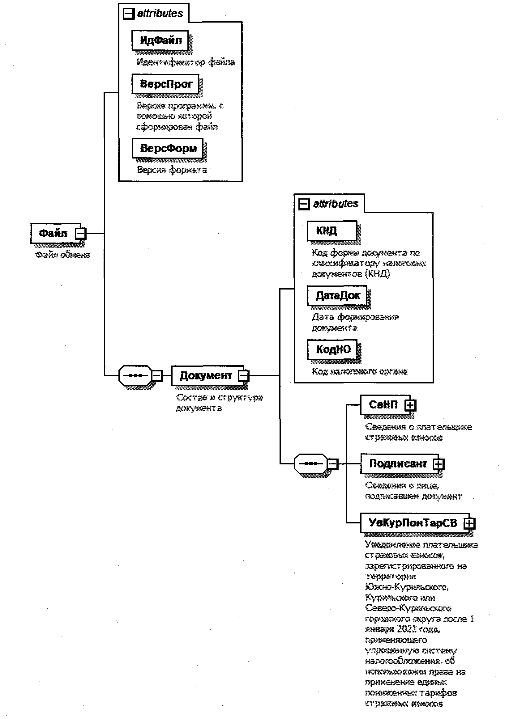 | Уведомление плательщика страховых взносов, зарегистрированного на территории Южно-Курильского, Курильского или Северо-Курильского городского округа после 1 января 2022 года, применяющего упрощенную систему налогообложения, об использовании права на применение единых пониженных тарифов страховых взносов | УвКурПонТарСВ | С | О | Состав элемента представлен в таблице 4.7 |