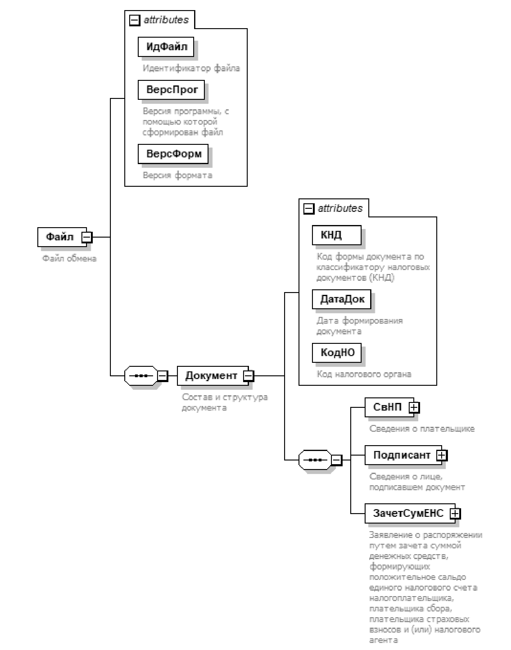 | Заявление о распоряжении путем зачета суммой денежных средств, формирующих положительное сальдо единого налогового счета налогоплательщика, плательщика сбора, плательщика страховых взносов и (или) налогового агента | ЗачетСумЕНС | С | О | Состав элемента представлен в таблице 4.7 |