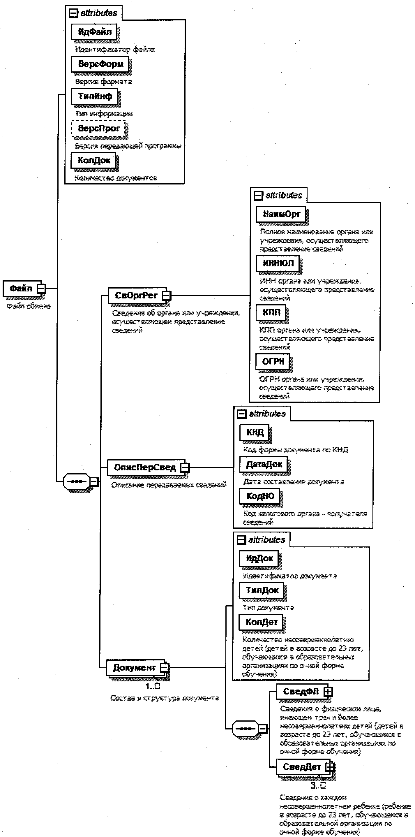 | Сведения о физическом лице, имеющем трех и более несовершеннолетних детей (детей в возрасте до 23 лет, обучающихся в образовательных организациях по очной форме обучения) | СведФЛ | С | О | Состав элемента представлен в таблице 4.5 | |