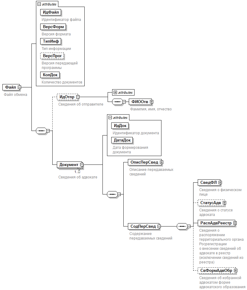 | Сведения о статусе адвоката | СтатусАдв | С | Н | Состав элемента представлен в табл. 4.8. Элемент обязателен при <ВидРасп> = 1 | 3 | 4 | 6 (из табл.4.9) |