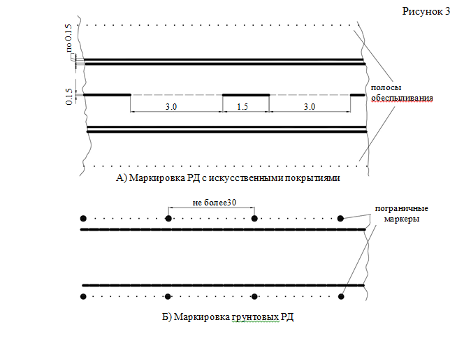 10.2. С двух сторон РД с искусственным покрытием должны быть предусмотрены полосы обеспыливания. Общая ширина РД и двух полос обеспыливания должна быть не менее: