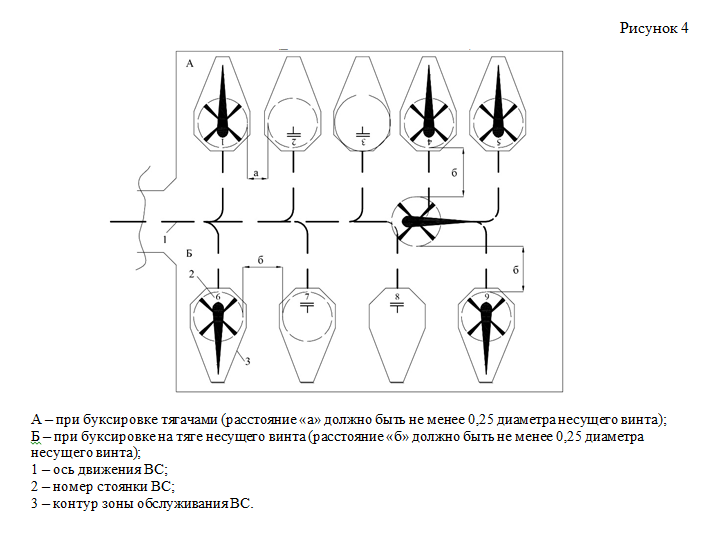 12. Размеры МС и швартовочных площадок должны соответствовать габаритам эксплуатирующихся вертолетов. Расстояние между концами лопастей винтов, стоящих и рулящих на собственной тяге вертолетов или вертолетов, буксируемых тягачом должны быть в зависимости от диаметра несущего винта (D) расчетного типа вертолета не менее: