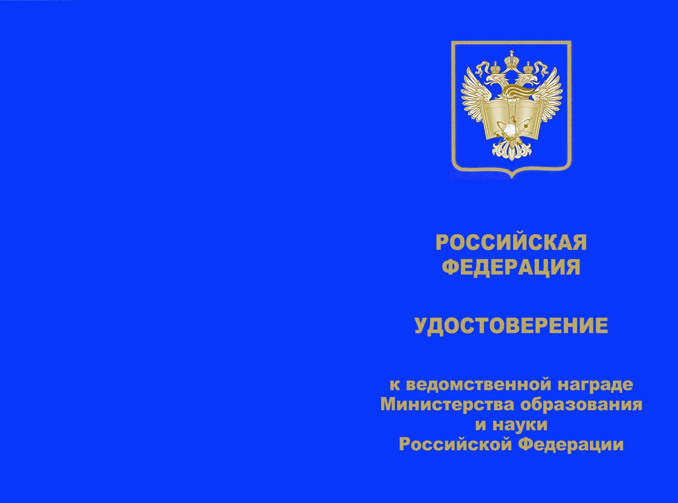 На лицевой стороне удостоверения сверху эмблема Министерства образования и науки Российской Федерации в рамке цветности 2+0. В центре надпись заглавными буквами "Российская ФЕДЕРАЦИЯ" и через промежуток - "Удостоверение". Далее в четыре строки надпись прописными буквами "к ведомственной награде Министерства образования и науки Российской Федерации". Оборотная сторона - чистая.