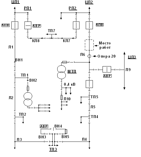 Рисунок 2. Схема участка распределительной электросети 6-10 кВ, секционированной в ТП3 в нормальном режиме работы