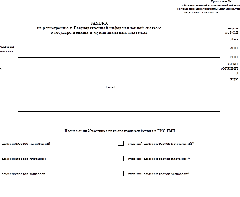 При регистрации в ГИС ГМП Участником прямого взаимодействия формируется и направляется с использованием ГИС ГМП в территориальный орган Федерального казначейства по месту нахождения Участника прямого взаимодействия Заявка на регистрацию в Государственной информационной системе о государственных и муниципальных платежах по форме согласно приложению N 1 к настоящему Порядку (код формы по ведомственному классификатору форм документов (далее - код формы по КФД) 0531201) (далее - Заявка на регистрацию) в форме электронного документа.