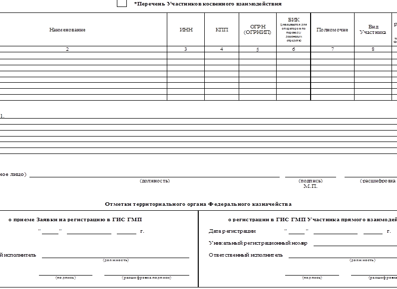 2.7. В "Отметке территориального органа Федерального казначейства" указываются дата приема Заявки на регистрацию в ГИС ГМП, дата регистрации в ГИС ГМП Участника прямого взаимодействия, УРН, присвоенный Участнику прямого взаимодействия при регистрации в ГИС ГМП, а также подпись уполномоченного сотрудника территориального органа Федерального казначейства, его должность, расшифровка подписи с указанием фамилии и инициалов.