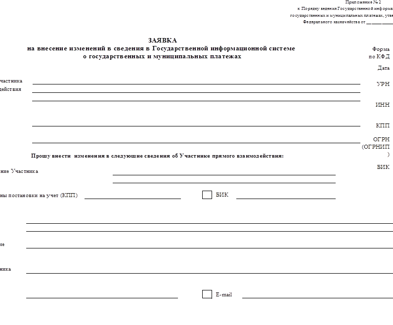 Для внесения изменений в сведения, представленные в территориальный орган Федерального казначейства, Участником прямого взаимодействия формируется и направляется в территориальный орган Федерального казначейства по месту регистрации Участника прямого взаимодействия Заявка на внесение изменений в сведения в Государственной информационной системе о государственных и муниципальных платежах по форме согласно приложению N 2 к настоящему Порядку (код формы по КФД 0531202) (далее - Заявка на внесение изменений).