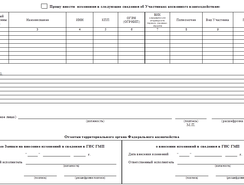 Графа 10 табличной части Заявки на внесение изменений заполняется путем указания наименования изменяемых сведений об Участнике косвенного взаимодействия (в случае внесения изменений в сведения об Участнике косвенного взаимодействия) либо слова "добавить" - при регистрации в ГИС ГМП нового Участника косвенного взаимодействия.