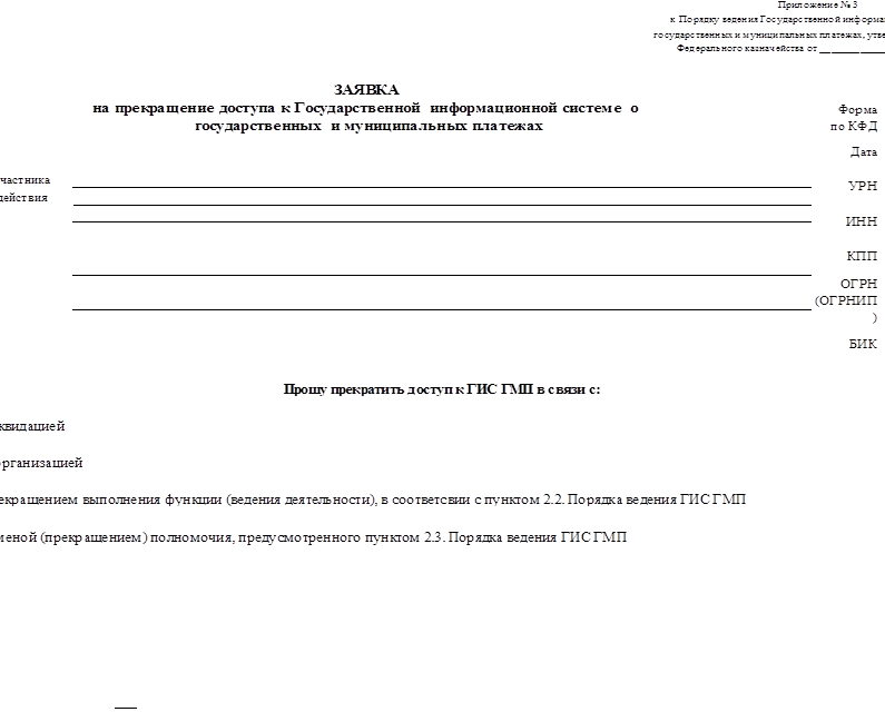 Прилагаются формы заявок на регистрацию участника, на внесение изменений в сведения, на прекращение доступа к ГИС ГМП. Приводятся указания по их заполнению.