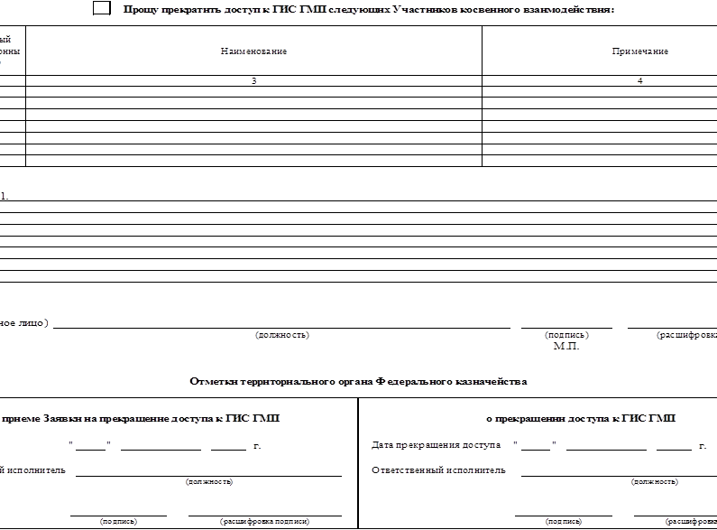 4.3.2. В случае прекращения доступа к ГИС ГМП Участников косвенного взаимодействия рядом с заявительной надписью "прошу прекратить доступ к ГИС ГМП следующих Участников косвенного взаимодействия" указывается знак "V" или "Х" с отражением соответствующей информации об Участниках косвенного взаимодействия в табличной части Заявки на прекращение доступа.