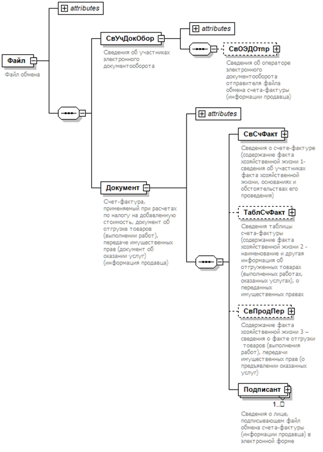 | Сведения о счете-фактуре (содержание факта хозяйственной жизни 1- сведения об участниках факта хозяйственной жизни, основаниях и обстоятельствах его проведения) | СвСчФакт | С | О | Состав элемента представлен в таблице 5.5 | |