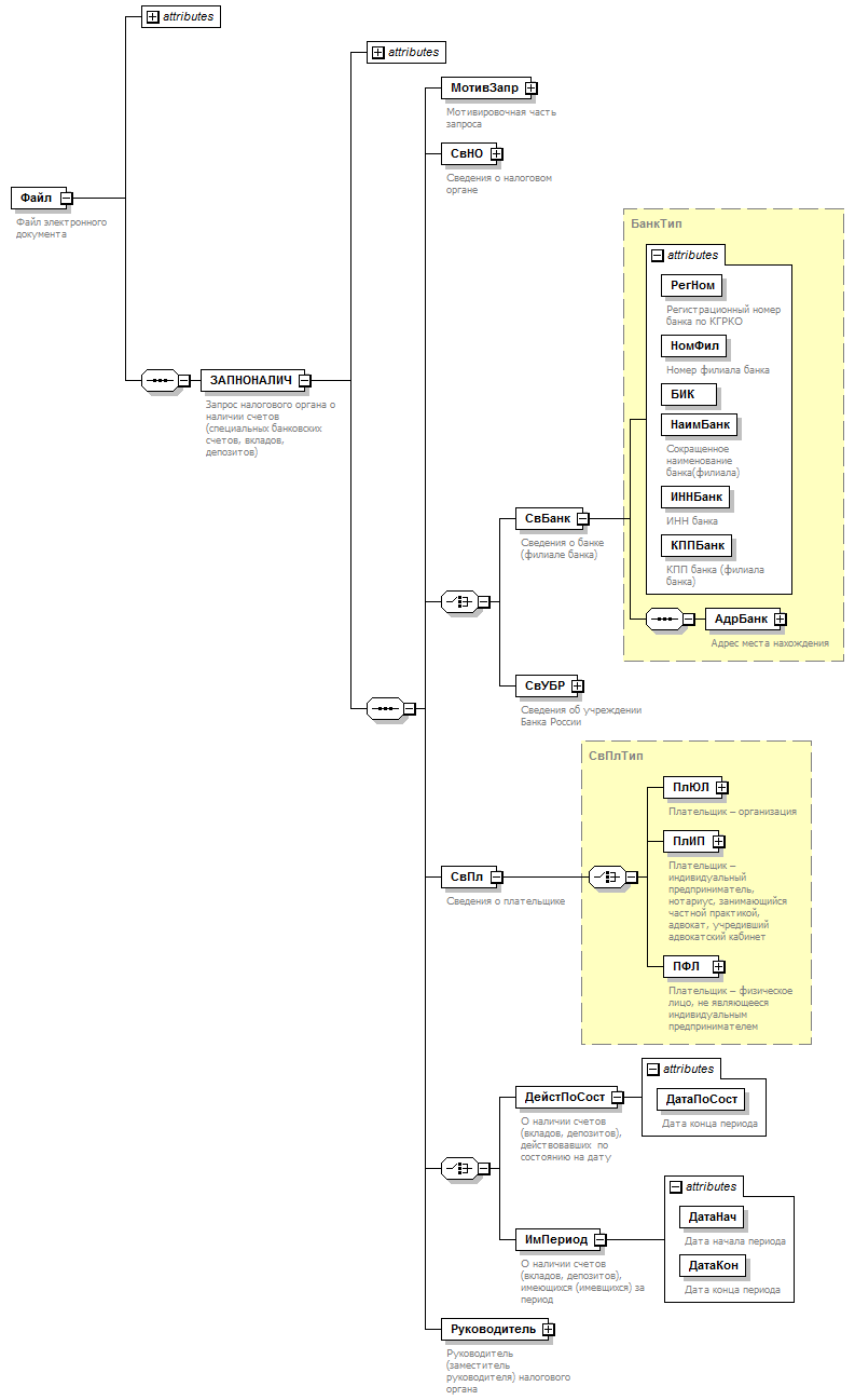 | Владельцем счета является лицо, в отношении которого сформирован запрос*(35) | Иное лицо, являющееся владельцем счета*(36) | УказЛицо ИноеЛицо | П С | T(=20) | О О | Принимает значение: "счет названного лица" Типовой элемент <СвПлТип>. Состав элемента представлен в таблице 4.8. Правила заполнения таблицы 4.8 в зависимости от данных реквизита <КодОбоснов> не применяются |