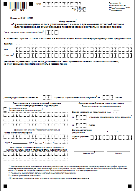 представления уведомления об уменьшении суммы налога, уплачиваемого в связи с применением патентной системы налогообложения, на сумму расходов по приобретению контрольно-кассовой техники