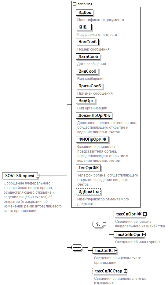 SOVLSRequest - Сообщение Федерального казначейства (иного органа, осуществляющего открытие и ведение лицевых счетов) об открытии (о закрытии, об изменении реквизитов) лицевого счета организации;
