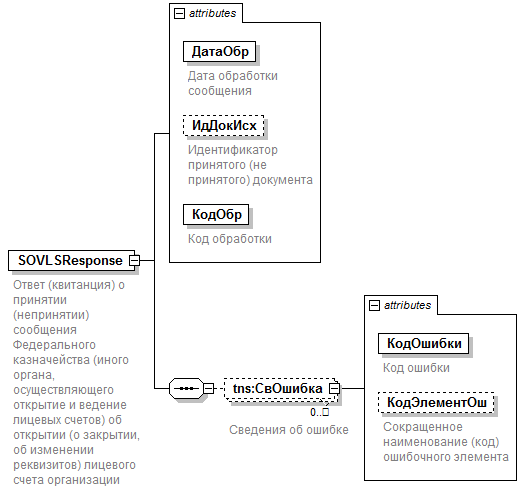 SOVLSResponse - Ответ (квитанция) о принятии (непринятии) сообщения Федерального казначейства (иного органа, осуществляющего открытие и ведение лицевых счетов) об открытии (о закрытии, об изменении реквизитов) лицевого счета организации.