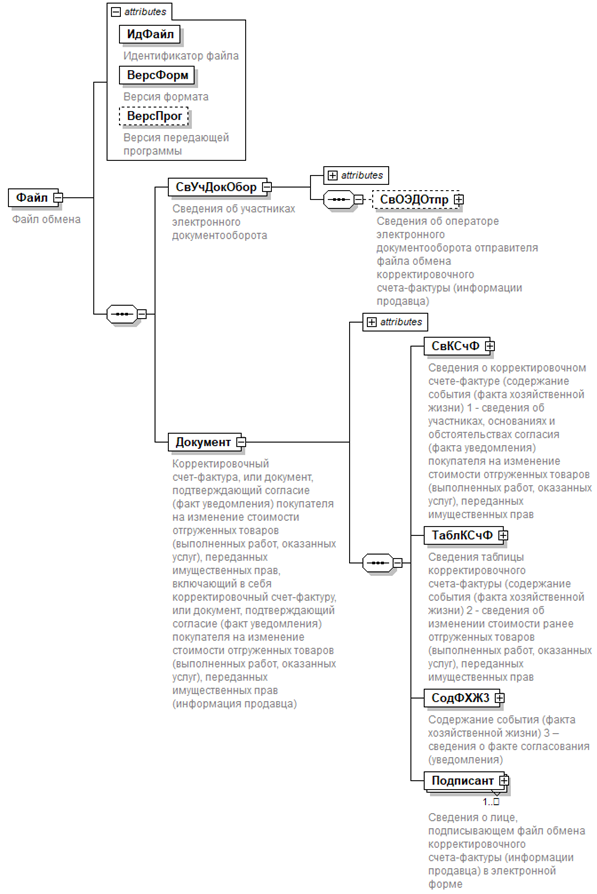 | Сведения об операторе электронного документооборота отправителя файла обмена корректировочного счета-фактуры (информации продавца) | СвОЭДОтпр | С | Н | Состав элемента представлен в таблице 5.3. Обязателен при направлении документа через оператора ЭДО СФ |