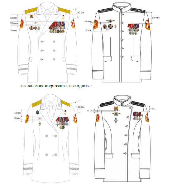 на кителе шерстяном выходном синего цвета, кителе шерстяном синего цвета - симметрично относительно вертикальной линии, условно проведенной по центру видимой части полочки, так, чтобы верхний край колодки знаков орденов и медалей первого ряда располагался ниже уровня начала шва втачивания воротника на 100 мм.