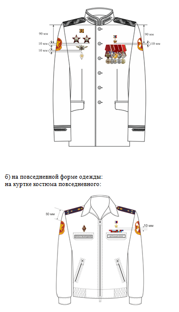 г) на куртке костюма повседневного синего цвета, на левой стороне груди так, чтобы нижний край медали располагался на 10 мм выше лент на планках.