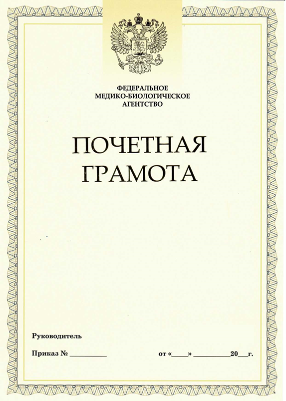 Бланк Почетной грамоты Федерального медико-биологического агентства (далее - Почетная грамота) представляет собой лист плотной матовой бумаги формата А4 (210 x 297 мм) бледно-желтого цвета.