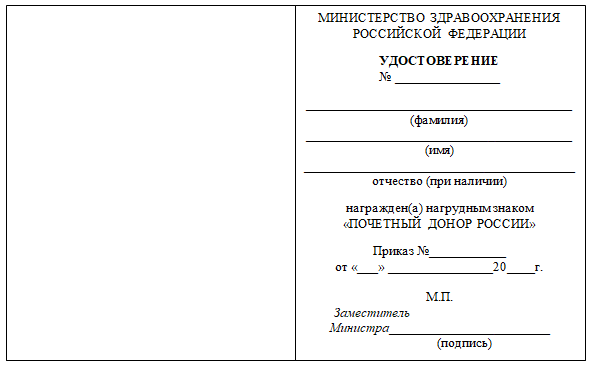 Образец удостоверения к нагрудному знаку "Почетный донор России"