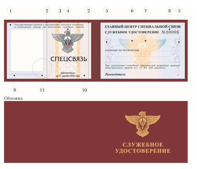 5. Справа от фотографии размещается цветная эмблема федерального государственного унитарного предприятия "Главный центр специальной связи", а под эмблемой находится надпись "СПЕЦСВЯЗЬ".