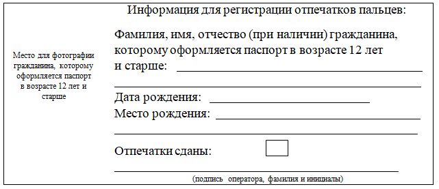 В заявлении указываются данные гражданина: фамилия, имя, отчество (при их наличии, одновременное отсутствие данных о фамилии и имени не допускается), в том числе ранее имевшиеся, пол, дата и место рождения, место жительства, место (места) работы (службы, учебы) в течение последних десяти лет, данные основного документа, удостоверяющего личность гражданина Российской Федерации (для детей в возрасте до 14 лет ? свидетельства о рождении), а также помещается его фотография в черно-белом или цветном исполнении размером 35 x 45 мм.