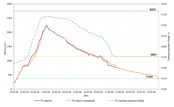Наибольший суточный приток в водохранилище был отмечен 4 мая 1966 г. и составил 2730 м?/с.
