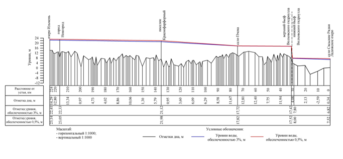 Продольные профили с координатами расчетных кривых свободной поверхности Волховского водохранилища и реки Волхов в верхнем (от озера Ильмень до Волховского гидроузла) и нижнем (от гидроузла до Ладожского озера) бьефах гидроузла Волховского водохранилища, при прохождении максимальных расходов воды расчетных обеспеченностей