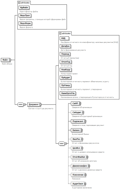 | Сведения об аудиторской организации | СвАудит | С | Н | Состав элемента представлен в таблице 4.5. Элемент отсутствует при <ПрАудит>=0 и может присутствовать или отсутствовать при <ПрАудит>=1 | |