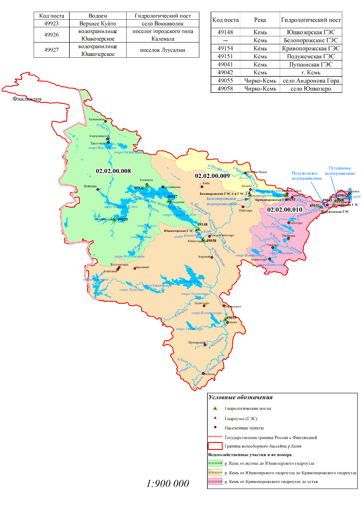 10. Карта-схема расположения с указанием границ гидрографических единиц и водохозяйственных участков, гидроузлов и водохранилищ на р. Кемь с нанесением положения постов гидрометрической сети наблюдений за водным режимом водных объектов приведена в приложении N 1 к настоящим Правилам.