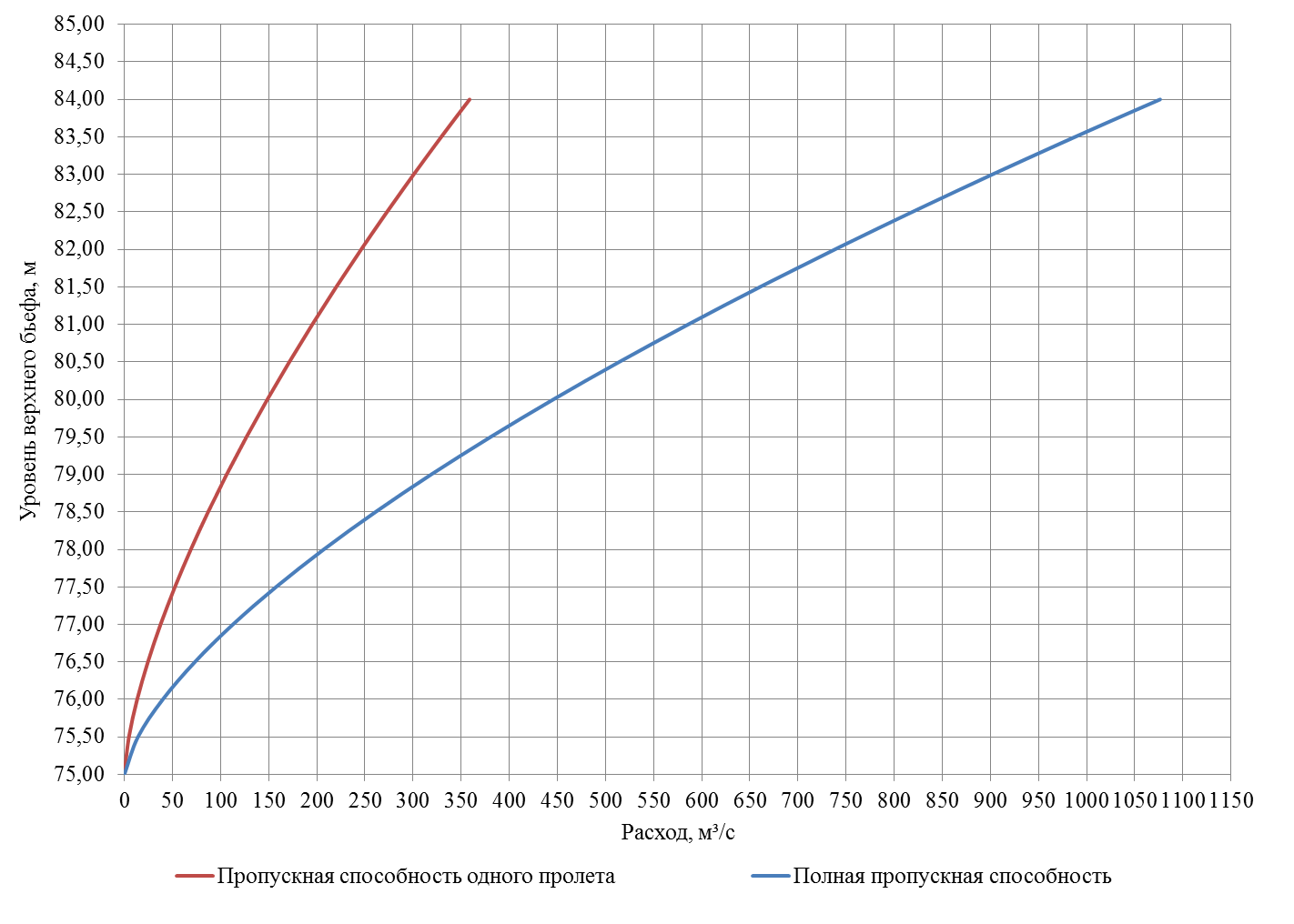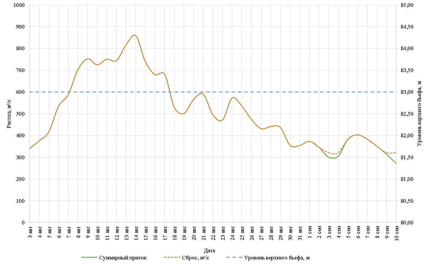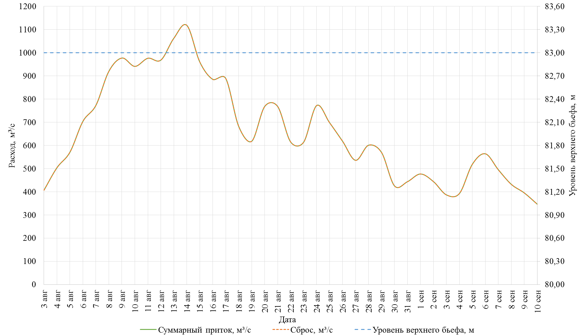График расчетных режимов пропуска модельных паводков (по модели 2012 г.) обеспеченностью 0,5 % через сооружения Белопорожского гидроузла при работе водохранилища на отметке НПУ