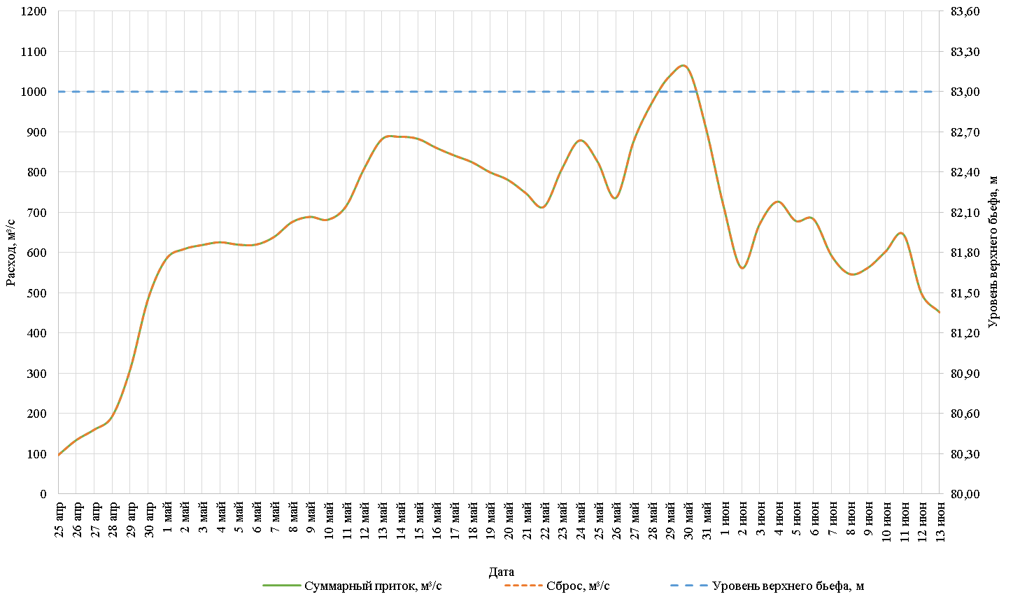 13. Максимальные расходы воды на р. Кемь наблюдаются в период половодья. В створах Белопорожского и Кривопорожского гидроузлов максимальные расходы формируются за счет сбросных расходов Юшкозерского гидроузла и боковой приточности с частного водосбора между Юшкозерским и Белопорожским гидроузлами, Белопорожским и Кривопорожским гидроузлами, соответственно.